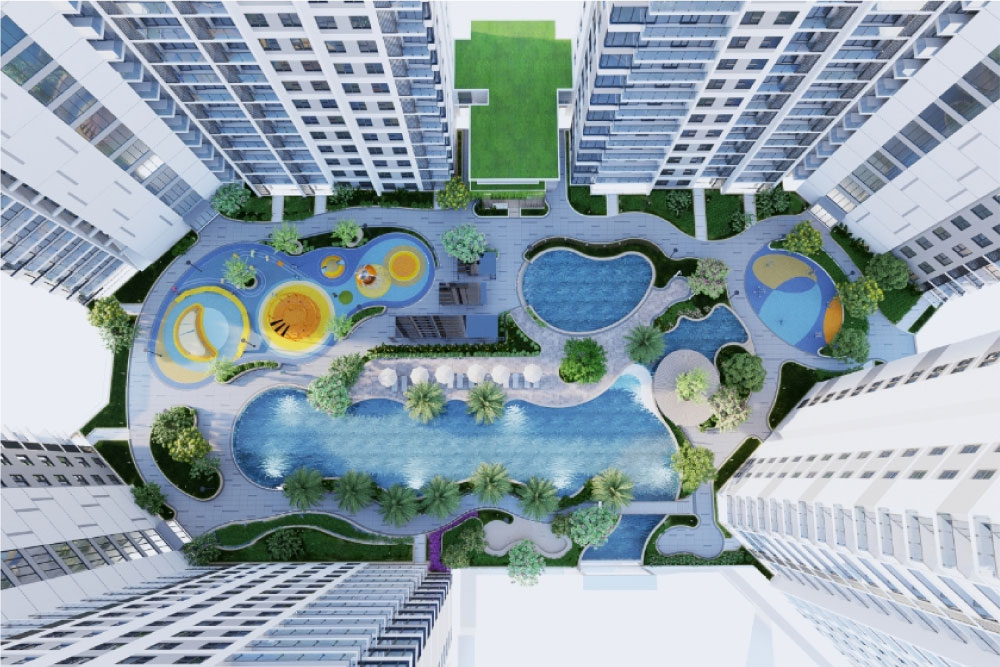 Điểm nhấn là 02 hồ bơi vô cực (tầng trệt & rooftop) và khối đế thương mại rộng lớn hơn 4.000m².